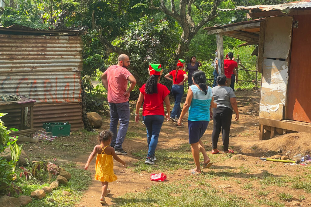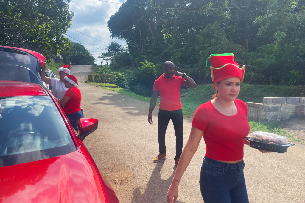 Una vez repartidas entre los carros las canastas, bolsas de arroz y pollos asados, nos dividimos en grupos para partir juntos con nuestros gorros de Navidad (y de elfo), nuestras camisas rojas y blancas, y con mucho entusiasmo hacia la comunidad donde haríamos el voluntariado.